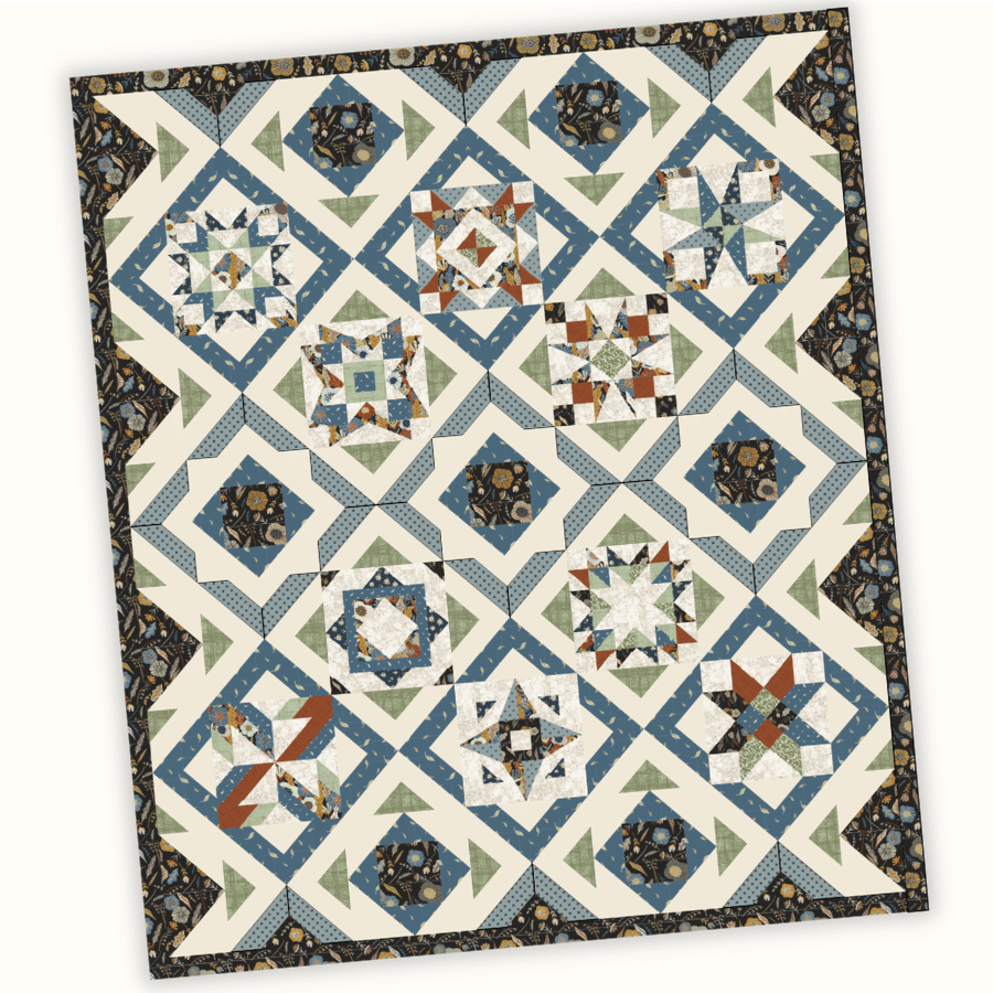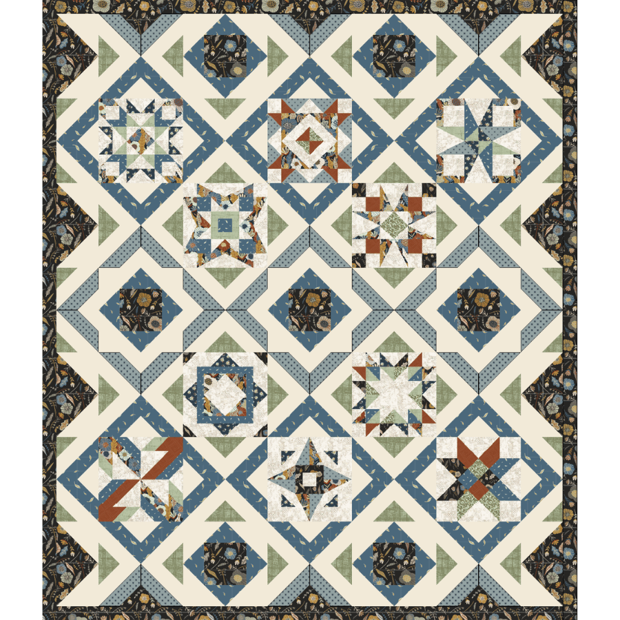 Show off your 2026 Build A Quilt blocks with the Layout 1 option for the Hidden Grove color way. Quilt measures 76″ x 88″